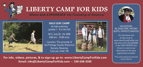 In 2013 the Portage County TEA Party spun off a novel idea to promote historical knowledge for school age children. The idea came from Nanette Zawistowski and Anne Kaczmarek who created the "Liberty Camp for Kids" summer day camp where children could "Experience the Found of America". They were quickly joined by Lanny and Brenda Derreberry and a host of annual volunteers and reinactors to put together a program that captivated kids throughout Northeast Ohio for over a decade. Without doubt, Liberty Camp for Kids, is one of the most successful efforts of the Portage County TEA Party. Thousands of Portage County children have "met" our founding fathers in persons each summer on the grounds of the Portage County Historical Society where children live as if it were 1775! The camp continues to this day under the leadership of Rita Scott and her team of volunteers.