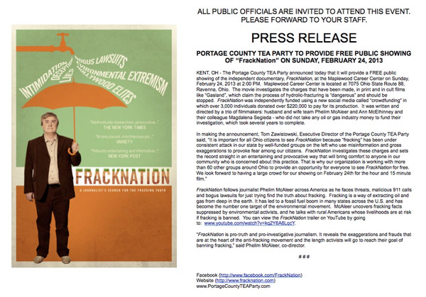 However, efforts were being made to keep the film out of movie theaters so that the public could not see the truth about fracking. So Tom organized an effort to have the film shown at TEA Party meetings throughout Ohio and even in some theaters that we rented for the showings. The film was a hit and it had a major impact on turning public opinion in Ohio in favor of fracking. That created the politcial environment for elected officials to act on May 24, 2013 to pass legislation which legally upheld hydrolic fracturing and making clear that local zoning ordinances or municipal bans cannot block fracking — only the state can regulate drilling.